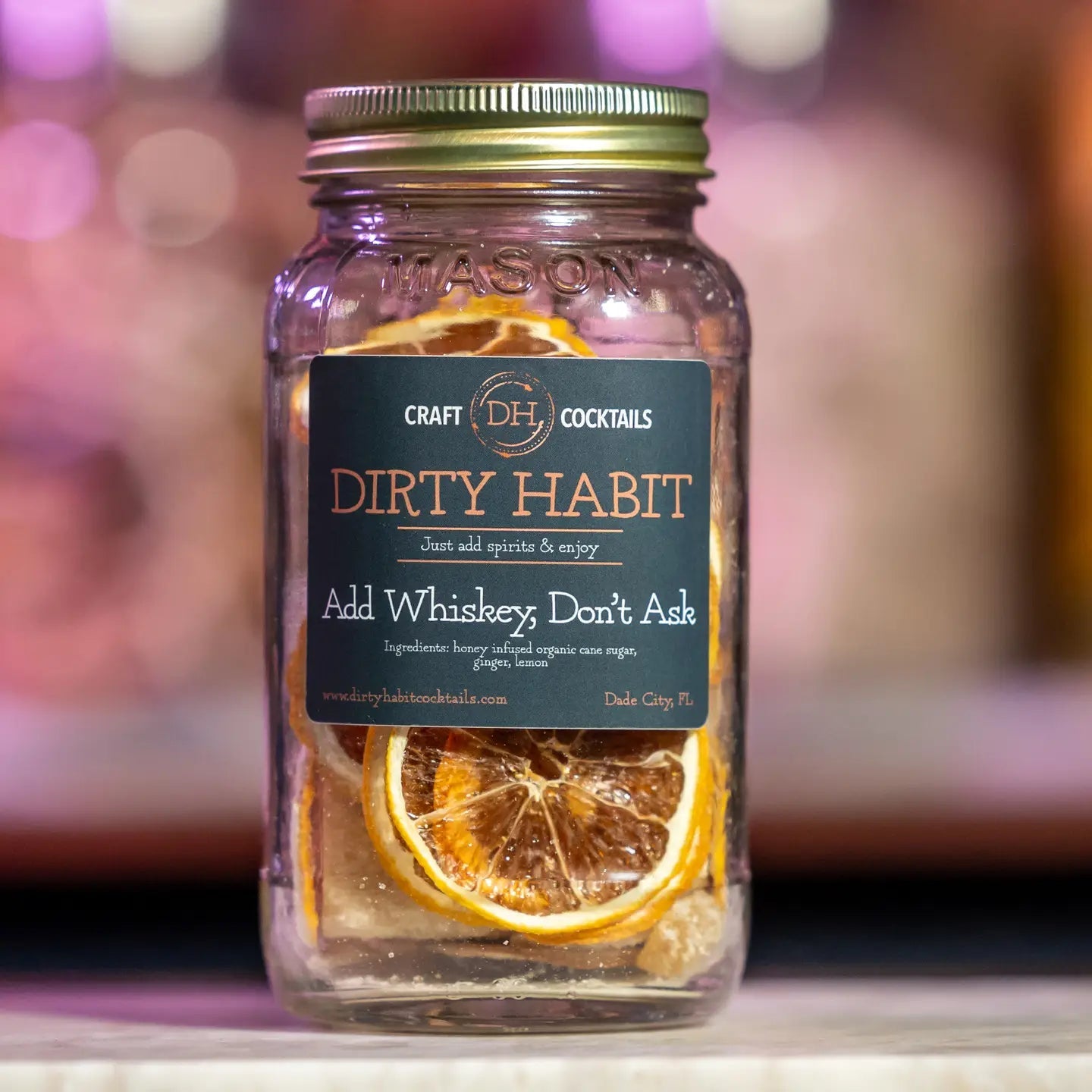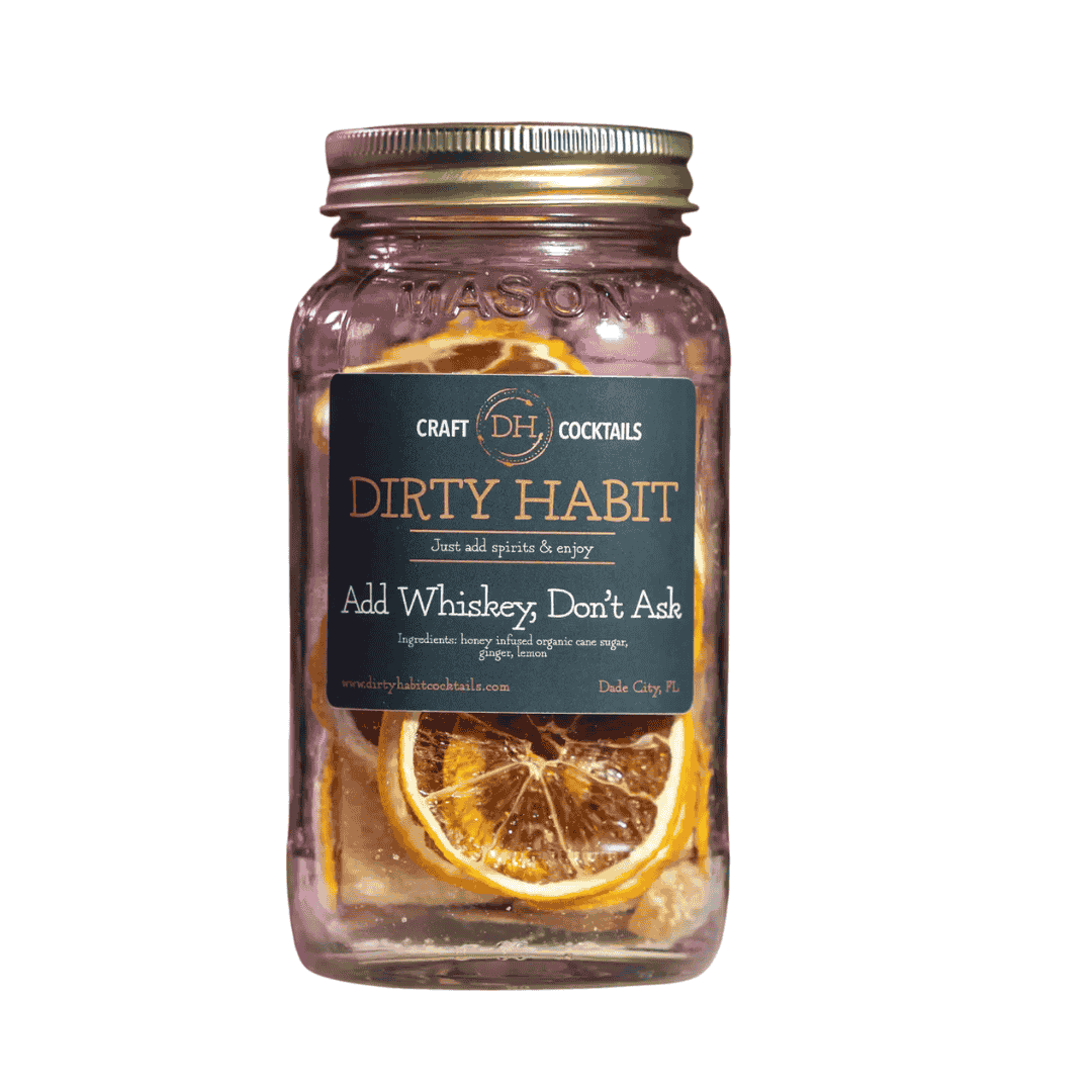 Add Whiskey, Don’t Ask is a honey, ginger, and lemon infusion designed for whiskey, bourbon, vodka, or tequila. Just add your favorite spirit, let it chill, and enjoy a smooth, refreshing cocktail—or mix with soda for a mocktail.