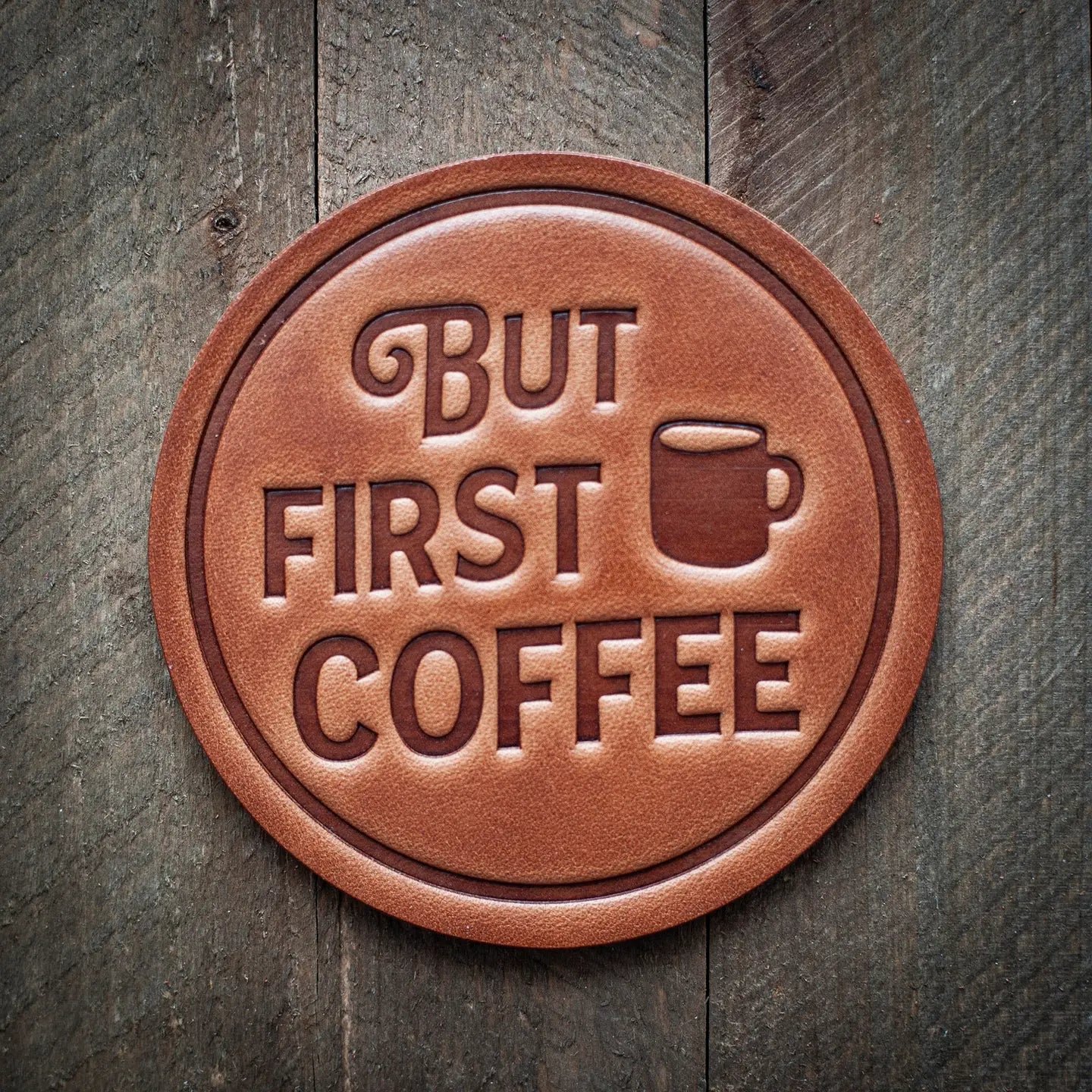 The But First Coffee Coaster is hand-cut and pressed from thick, premium harness leather that patinas beautifully over time, bringing character and durability to every cup you enjoy.
