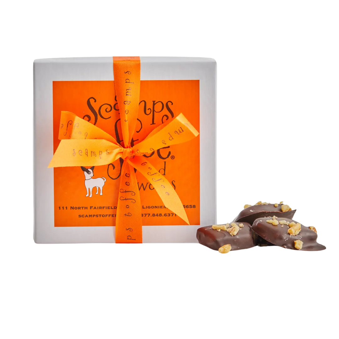Rich, buttery toffee hand-broken into pieces and enrobed in smooth chocolate. This award-winning treat comes in a 4oz signature orange gift box tied with a bow—perfectly packaged and irresistibly delicious.