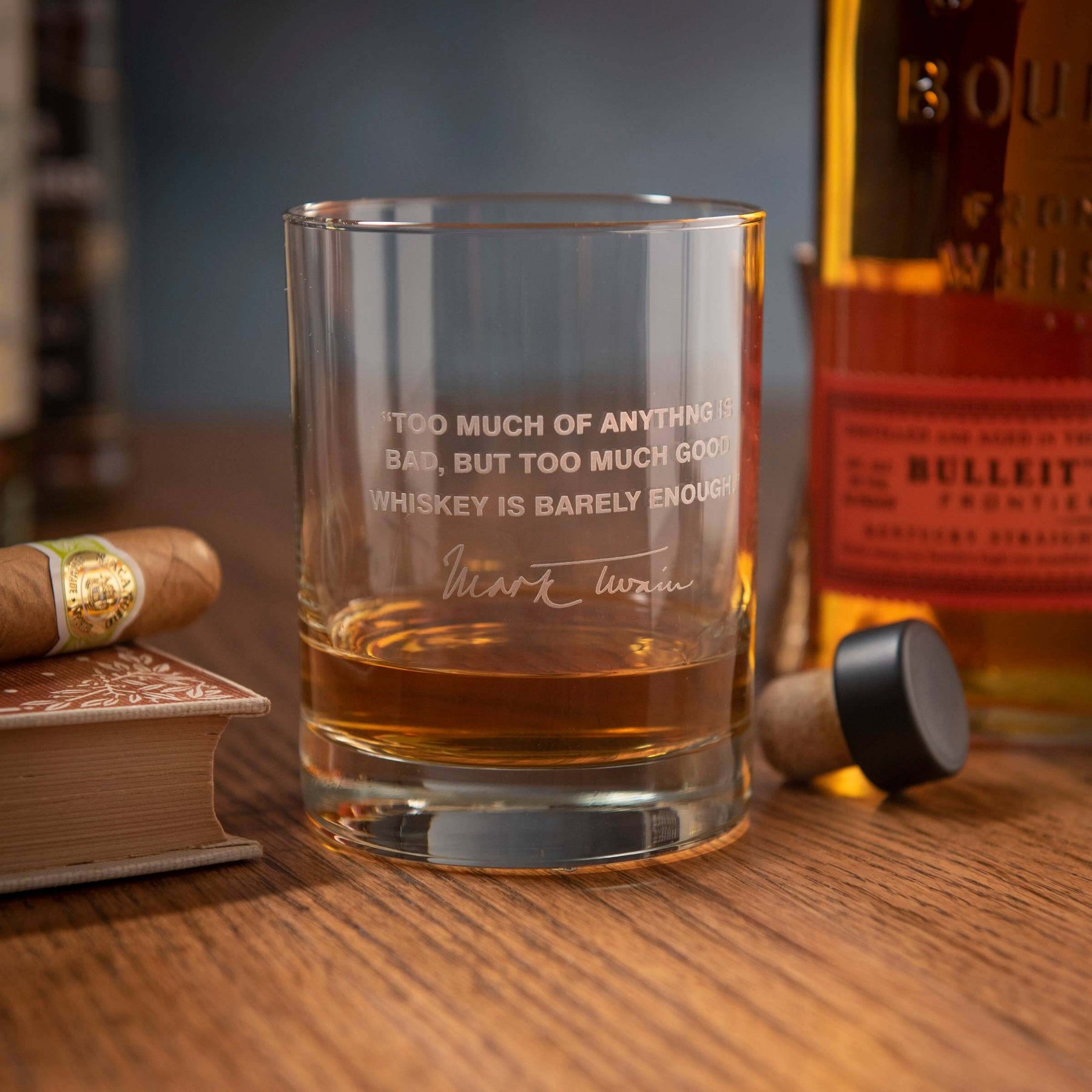 “Too much of anything is bad, but too much good whiskey is barely enough.” - Mark Twain. This whiskey quotes glass makes a wonderful gift for whiskey lovers or anyone who appreciates top-quality products. Our engraved whiskey glasses include a wonderful collection of whiskey lovers and bourbon drinkers’ quotes as well as motivating sports quotes. Each engraved 13 oz Double Old Fashion (DOF) glass set is etched with a famous quote on a top-quality glass. Glasses for all occasions or just for the heck of it … the perfect gift for all. All of our glass and crystal products are manufactured by sand-carving. Sand-carving involves using compressed air to force a stream of abrasive through a nozzle and onto the glass to etch or carve a design. Versatility and superior end results are the primary reasons for choosing this method for personalizing glass products. Glass is dishwasher safe.